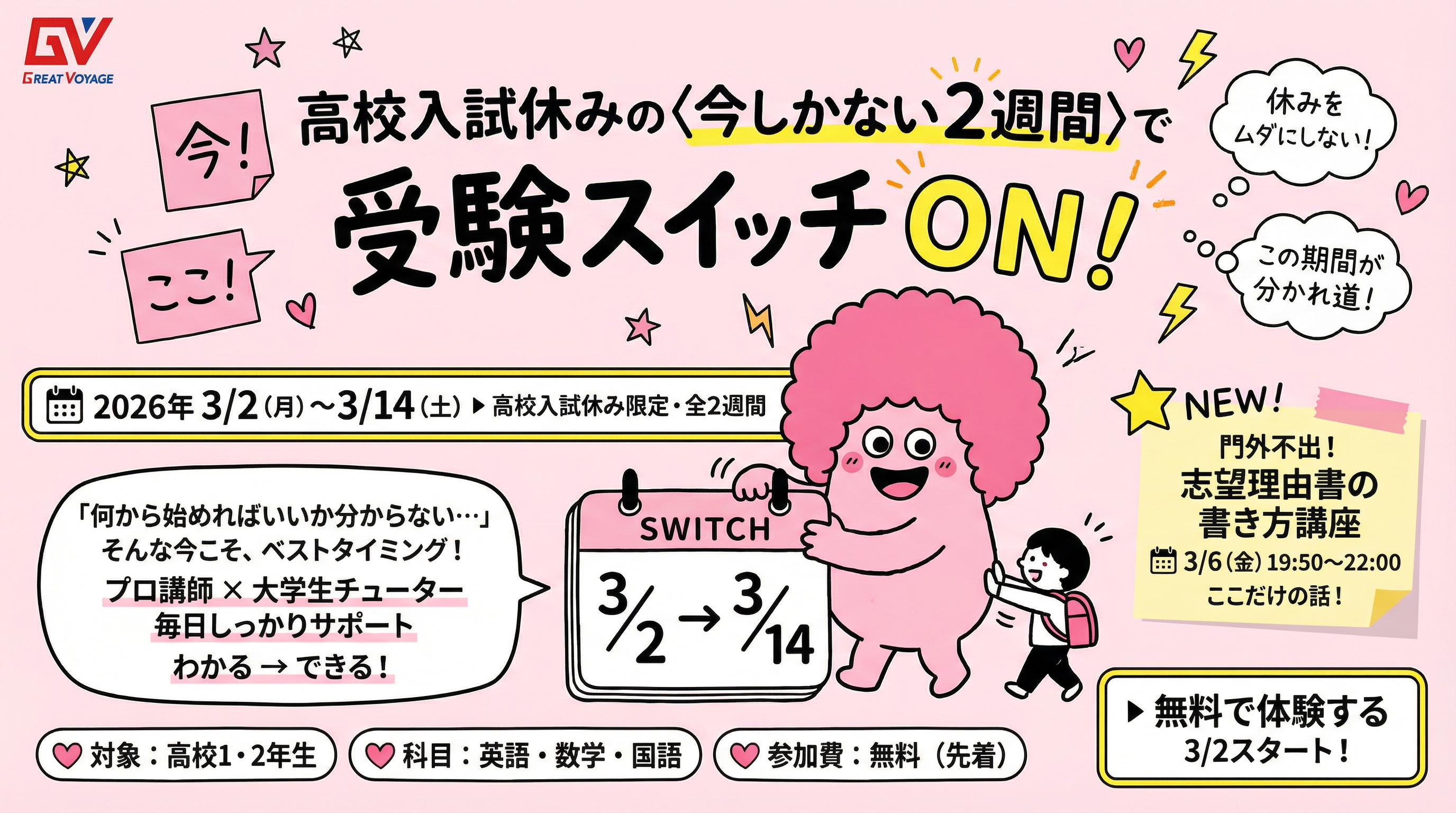 大学受験予備校グレイトヴォヤージュに通塾し、合格を掴み取った受講生の声となっております。グレイトヴォヤージュってどんな予備校なの?どんな先生がいるの?他塾と比べて、特徴的なサービスは何かあるの?という全ての疑問をリアルな声でまとめてあります。あなたと同じタイプの先輩を探してみましょう。